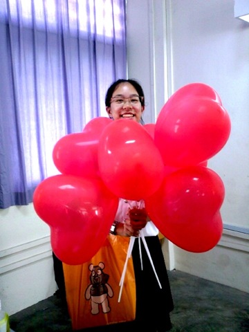 here's nien an in our classroom, holding her balloons in one hand and a plastic bag which contains her pressies in another hand. e pic's nicely taken ain't it? cos e photographer's mii xD
